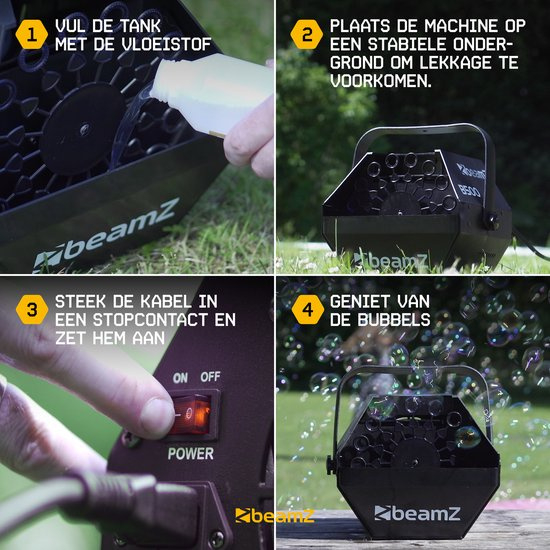 - Maakt gebruik van standaard bellenblaasvloeistof